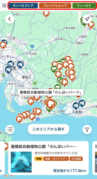 画面上部のボタンから、探したいお店や場所の種類を同時に選ぶこともでき、行きたいお店や場所が一挙に見つかります。
