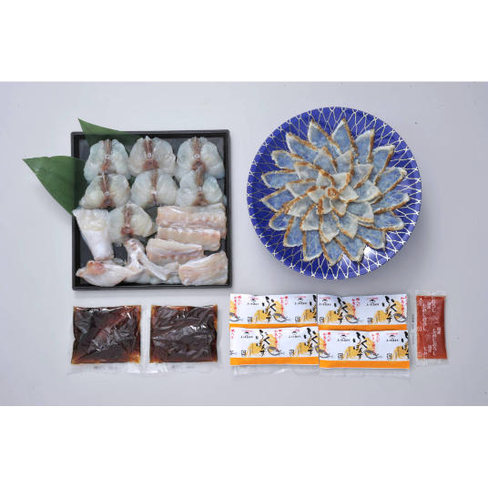 【素材】【ふぐちり具材】標準和名マフグ(国産)、食塩/トレハロース、【ポン酢】醤油(大豆・小麦を含む、国内製造)、橙果汁、醸造酢、みりん、だし(かつお節、そうだかつお節、むろあじ節)、昆布エキス、食塩、【ふぐ鍋だし】フグのだし[標準和名ゴマフグ(日本海西部、北部)]、醤油(大豆・小麦を含む)、発酵調味料、清酒、食塩、昆布エキス、かつおエキス、白菜エキス、酵母エキス、しいたけエキス、【ふぐ炙り刺身】標準和名マフグ(山口県)、食塩/トレハロース、【モミジオロシ】大根(国産)、赤ピーマン、醸造酢、唐辛子/増粘剤(マンナン)