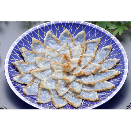 【内容量】まふく炙り刺身80g(プラスチック皿22cm)、まふくちり身・アラ400g、ふく鍋だし45g×2、ポン酢35g×4、モミジオロシ16g ※刺身皿のデザインは変わる場合がございます。