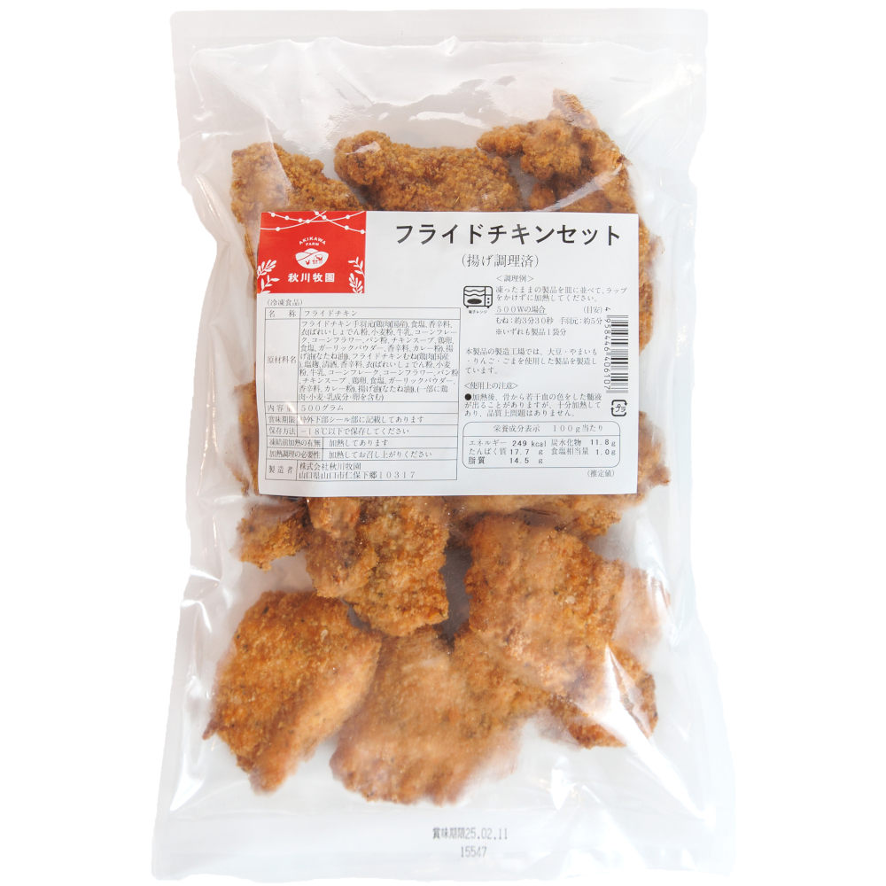 【素材】フライドチキン手羽元(鶏肉(国産)、食塩、香辛料、衣(ばれいしょでん粉、小麦粉、牛乳、コーンフレーク、コーンフラワー、パン粉、チキンスープ、鶏卵、食塩、ガーリックパウダー、香辛料、カレー粉)、揚げ油(なたね油))、フライドチキンむね(鶏肉(国産)、塩麹、清酒、香辛料、衣(ばれいしょでん粉、小麦粉、牛乳、コーンフレーク、コーンフラワー、パン粉、チキンスープ、鶏卵、食塩、ガーリックパウダー、香辛料、カレー粉)、揚げ油(なたね油))、(一部に鶏肉・小麦・乳成分・卵を含む)