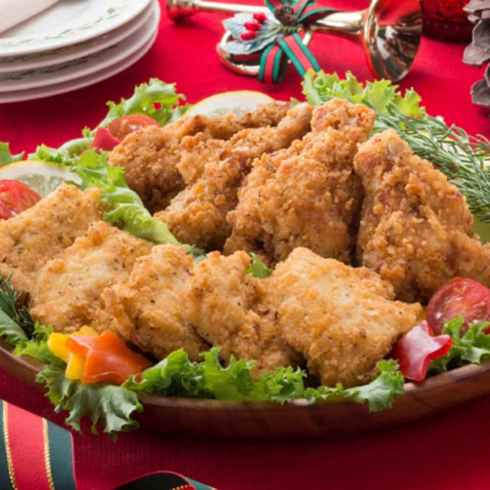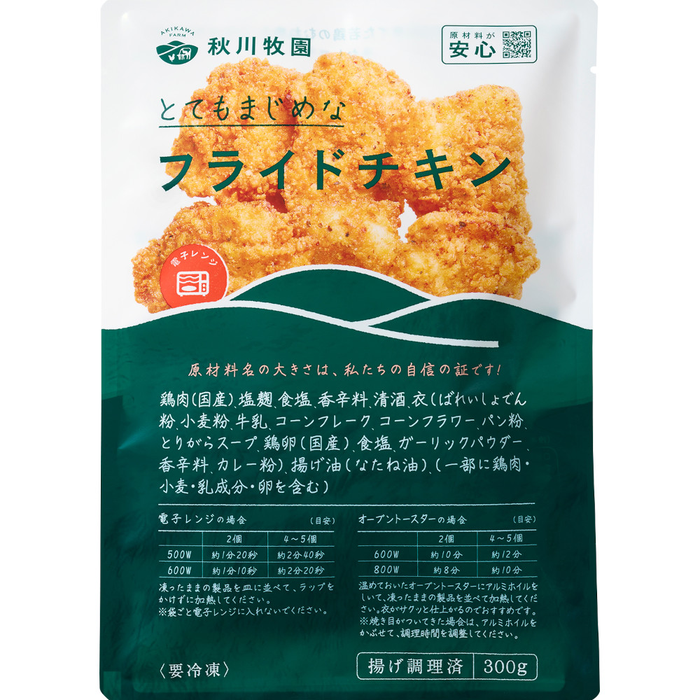 秋川牧園の若鶏のむね肉を使った、骨なしタイプのフライドチキンです。塩麹でお肉にやわらかさと旨みを加え、コーンフレークをブレンドした衣でサクサク食感をプラス。ハーブとスパイスを効かせ、お肉のおいしさを引き立てました。お召し上がりの際、オーブントースターを使用していただくと衣のサクサク感が増し、揚げたての食感に近づくのでおすすめです。