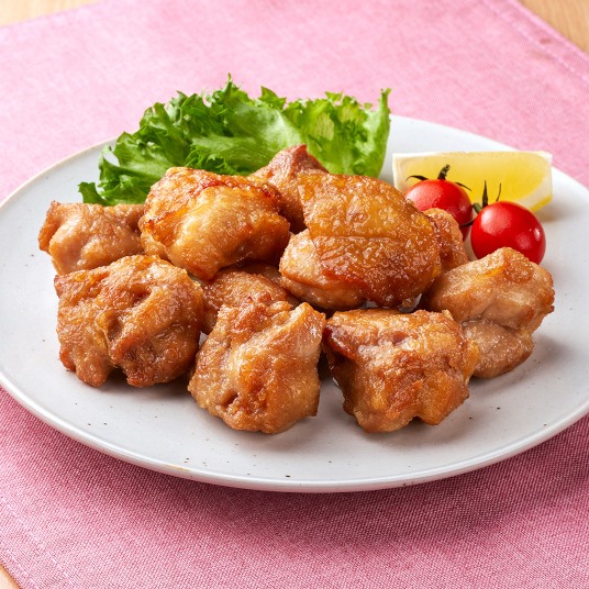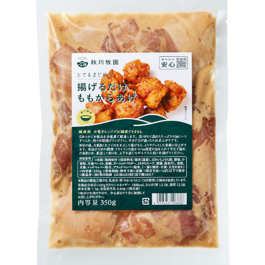 秋川牧園の国産若鶏もも肉を、自社オリジナルの醤油タレに漬け込みました。醤油タレは、生姜やにんにくを効かせ、とりがらスープや昆布だしで味に深みを出しており、からあげ作りで多い、事前に味見ができないお悩みにも応える、失敗知らずのからあげです。手間のかかる下ごしらえや衣の準備が不要で、解凍して油で揚げるだけで、ご家庭でおいしくジューシーなからあげをお楽しみいただけます。パッケージには、少なめの油でも調理できるよう、フライパンでの調理方法も記載しています。