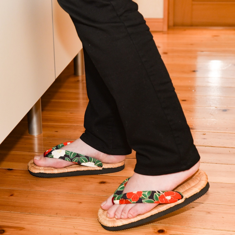 鼻緒の芯材を見直す事によって足が痛くならなず、ご自宅で過ごす時間を快適に過ごせるように工夫しています。竹皮草履は独自の抗菌効果に優れ、吸汗性、発散性に優れているので、暑い夏も安心して使用していただけます。また、天然素材であるため寒い冬も表面の温度が下がりにくいのが特長です。暑い夏に、寒い冬に…1年を通して使用できる1足に仕上がりました。