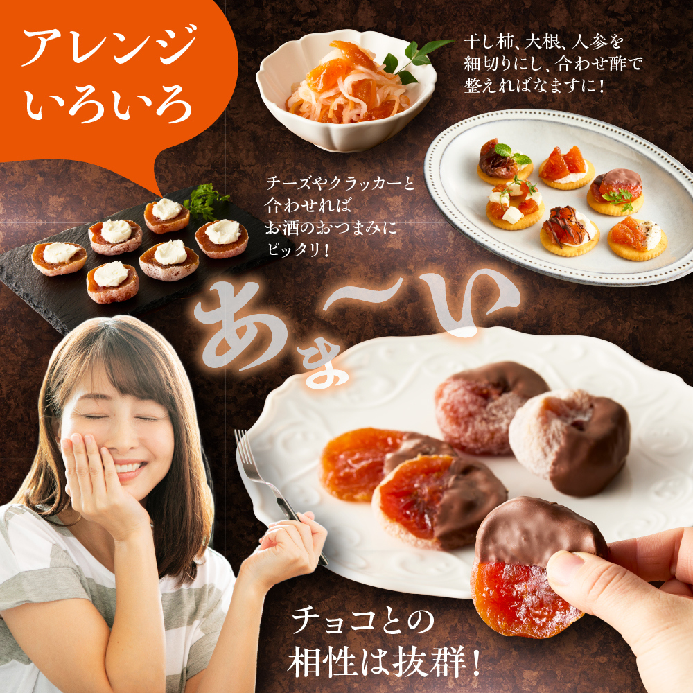 天ぷら、豆腐の白和え、お正月のなますにも最適です。チョコレートや、ヨーグルト、クリームチーズとの相性も抜群。 ワインやウイスキーとも合います。干柿は、『幸せをかきあつめる』『柿の連で人を束ねる』というように縁起物でもあります。