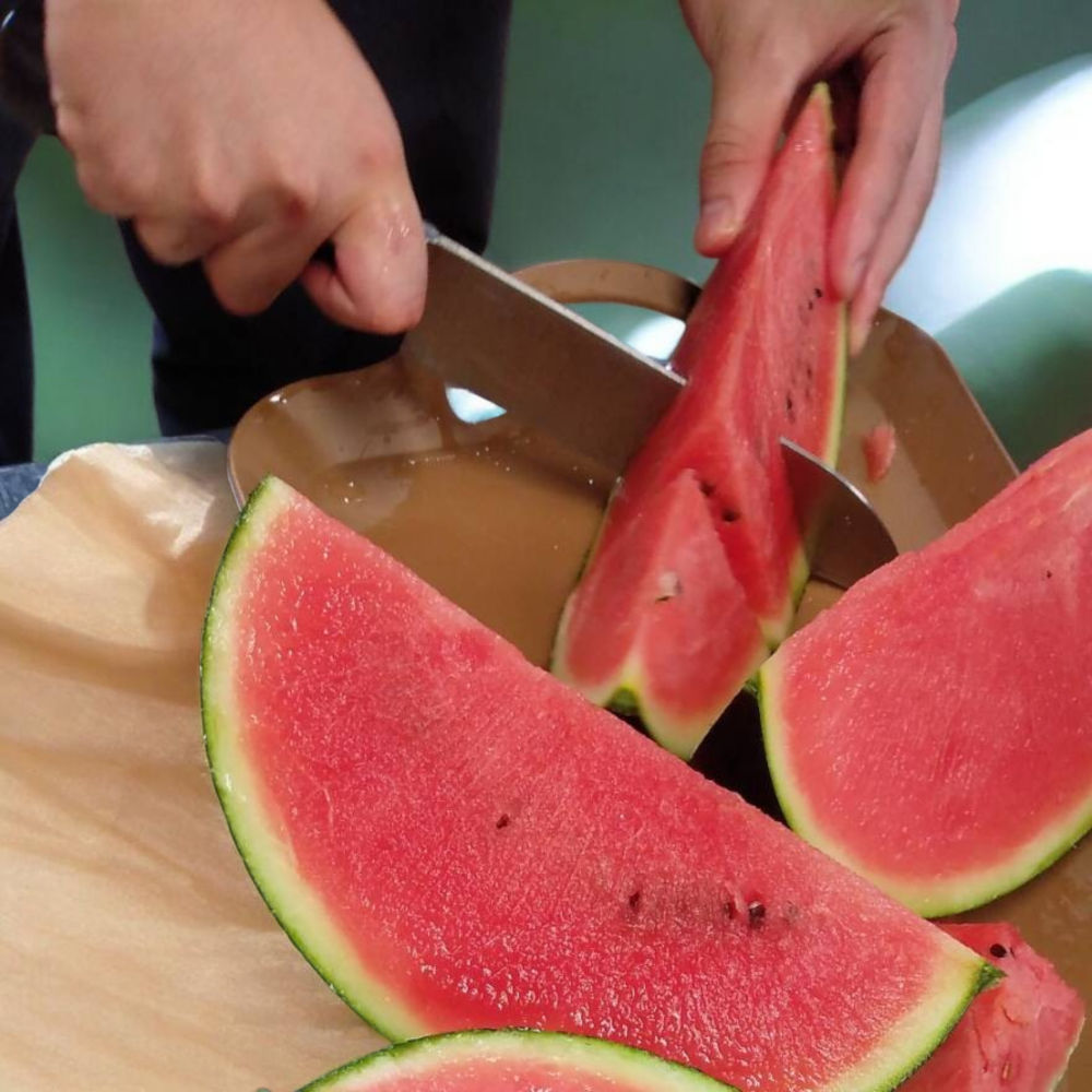 小玉西瓜「ひとりじめBonBonリッチ」は、光沢のある美しい黒皮が特徴の新種です。締まった肉質で糖度が高く、大玉にも負けないシャリ感が楽しめます。高温期でも果肉が崩れにくく、安定した濃厚な美味しさが魅力です。小玉西瓜なので大玉と違い場所をとりません。