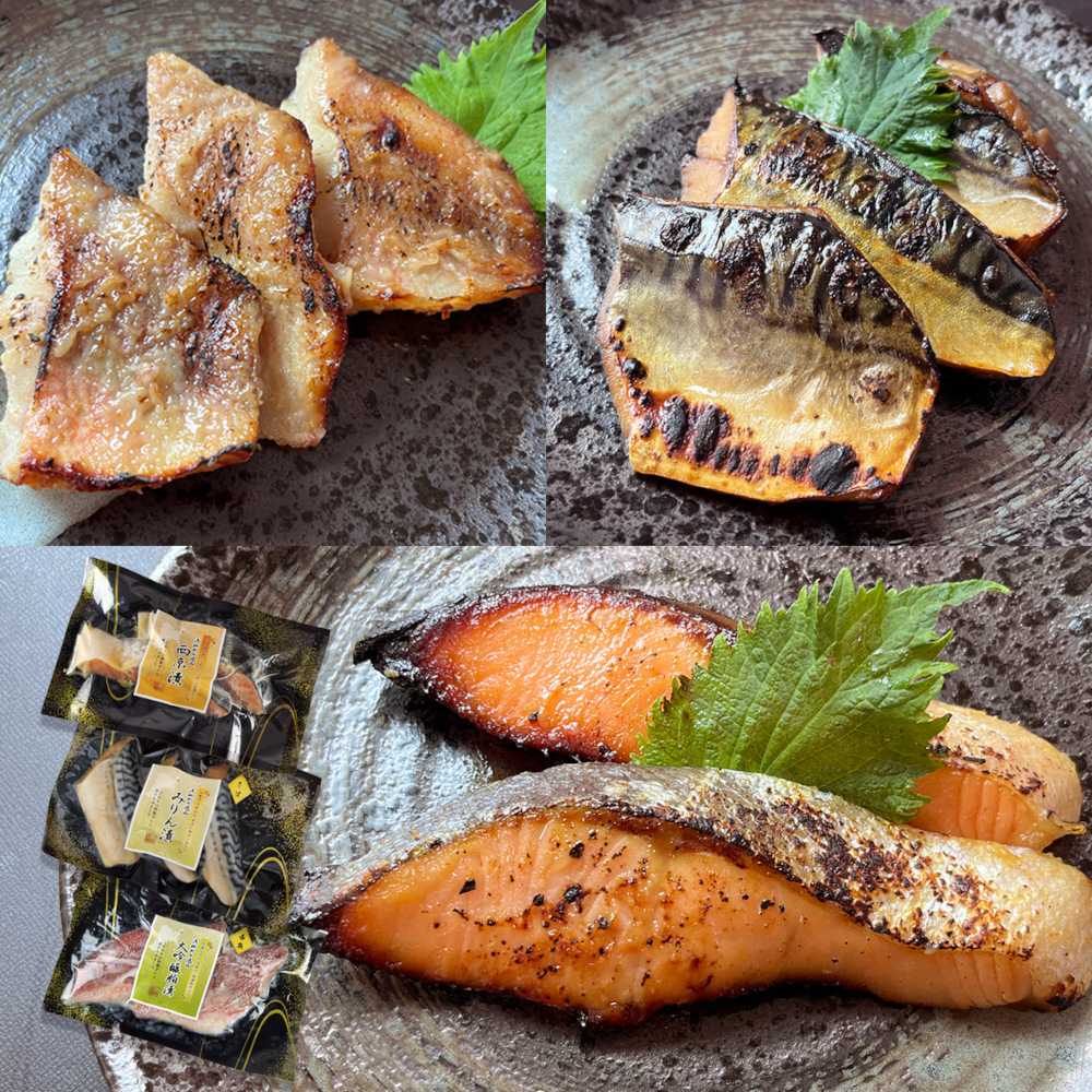 【内容量】宮城銀鮭西京漬 (70g×2切)× 1パック・赤魚大吟醸粕漬 (60g×3切)× 1パック・さばみりん漬 (3切)×1パック