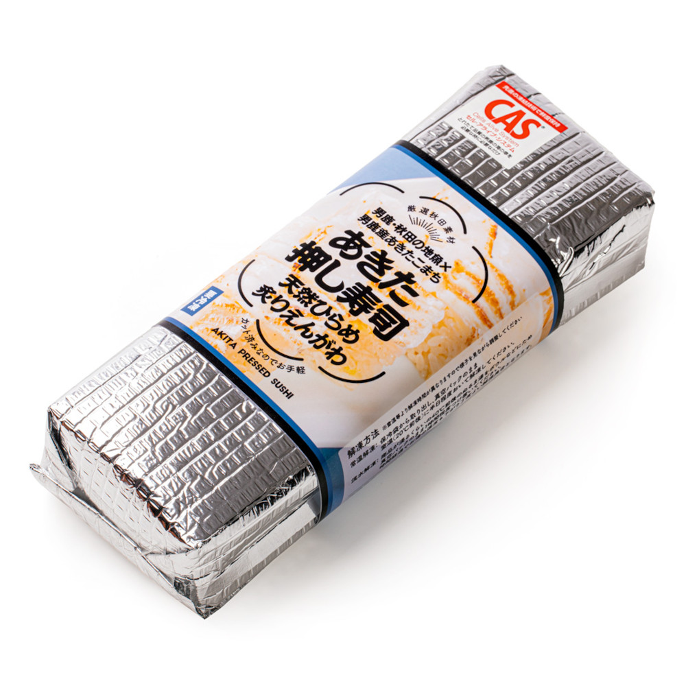 【素材】酢飯(うるち米(秋田県産)、赤酢、米酢、砂糖、和風だしの素、食塩)、ひらめ(秋田県産)、生姜酢漬け、(一部に小麦を含む)