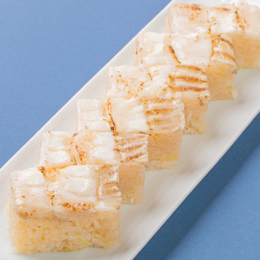 男鹿産天然ヒラメから僅かしか取れない希少なえんがわをぜいたくに使った押し寿司で、回転寿司などでよく提供されているカレイのえんがわと比べ上品な甘み・うまみが特徴です。カレイに比べると脂は控えめですが、炙ることでちゃんと脂のトロトロ感も味わえる仕上がりになっています。