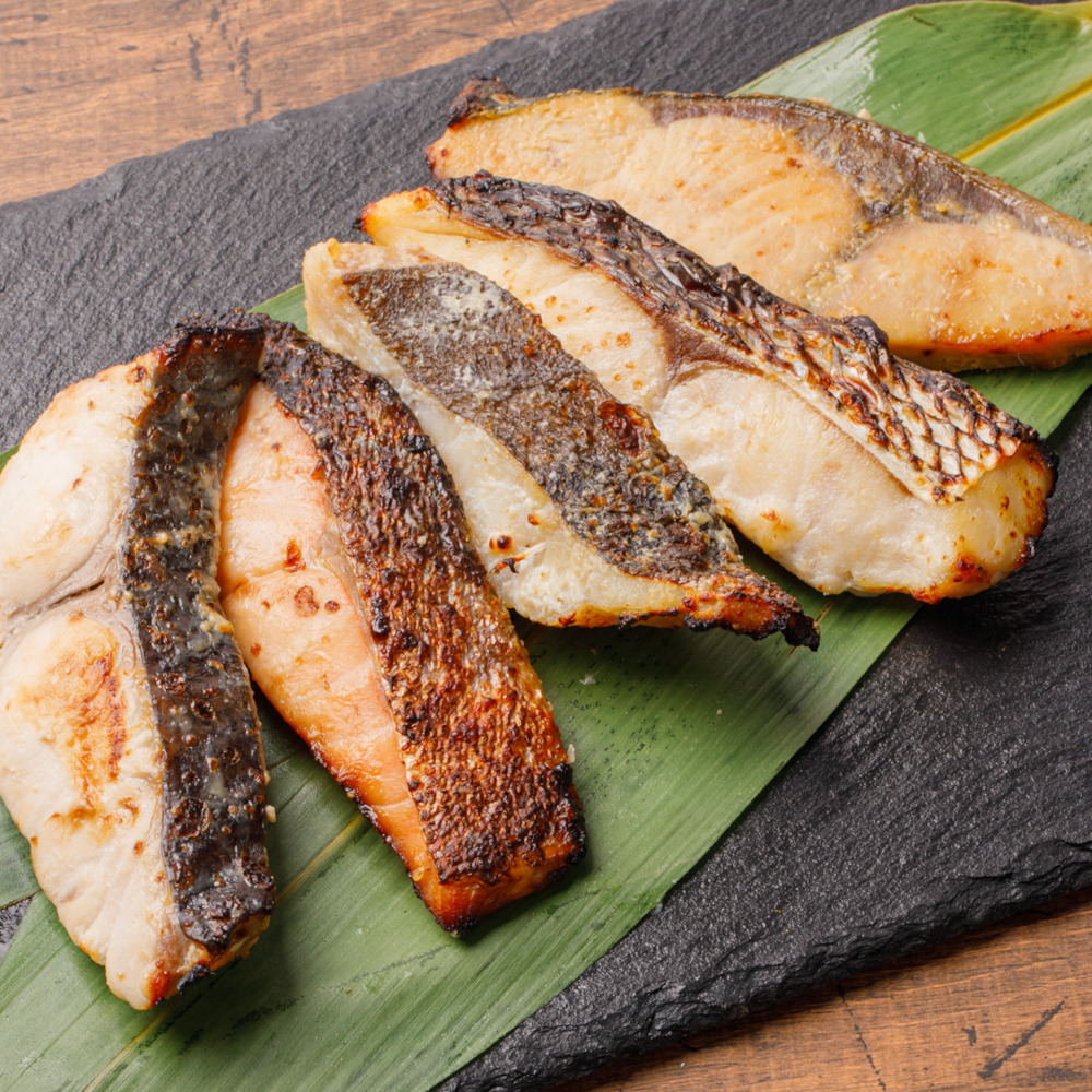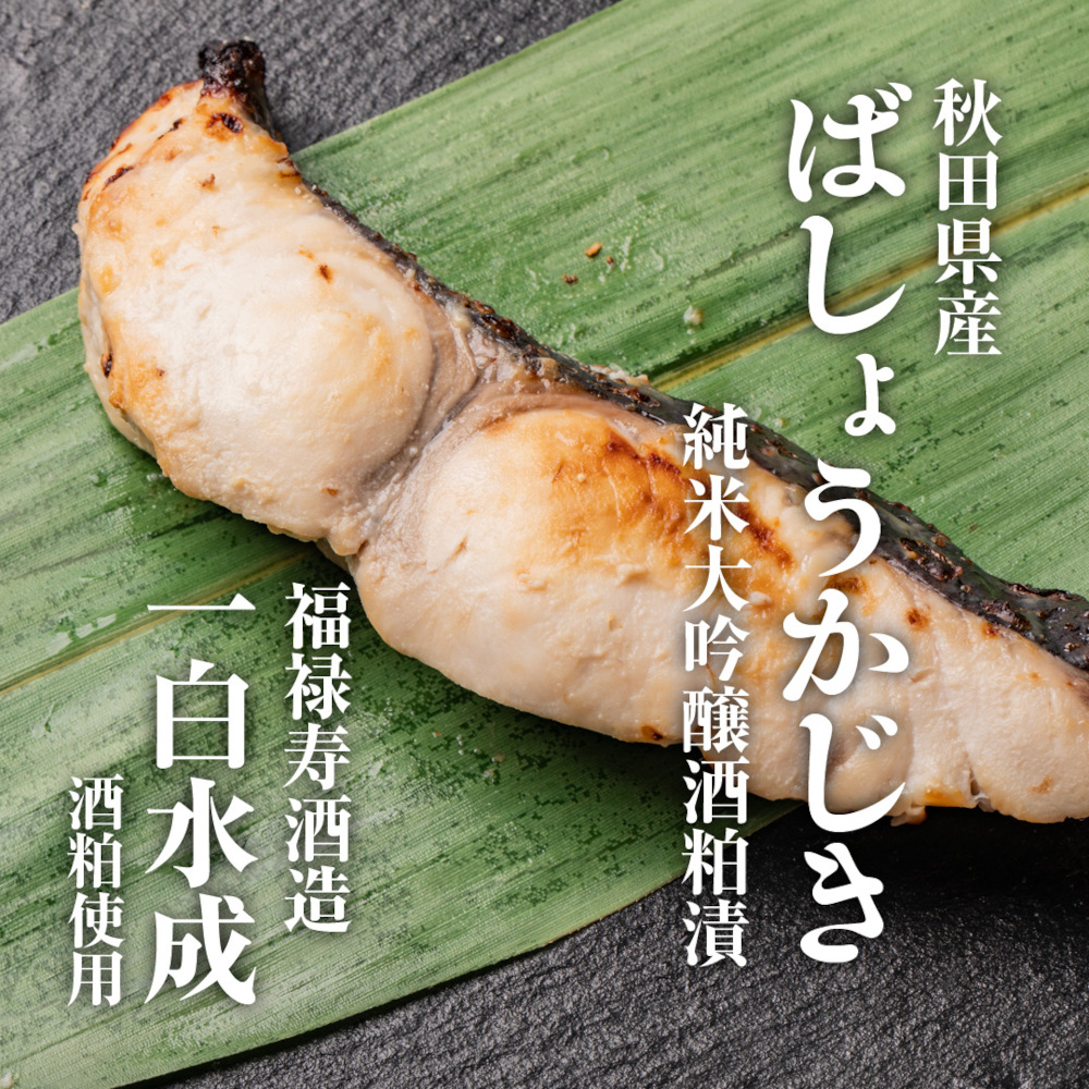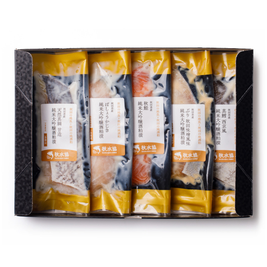 秋田県内で水揚げされた5魚種(真鯛、ぶり、さけ、たら、ばしょうかじき)の切り身を、美酒王国秋田にちなみ県内の五つの酒蔵(秋田酒造、浅舞酒造、奥田酒造店、天寿酒造、福禄寿酒造)の純米大吟醸酒粕をつかった粕漬を商品化しました。