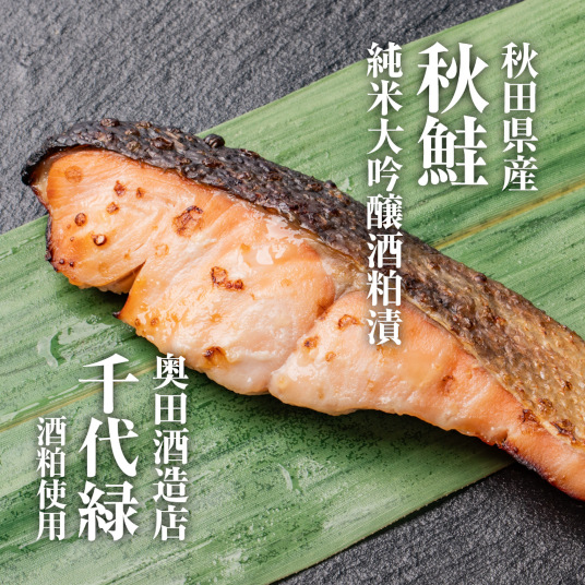 【秋鮭純米大吟醸酒粕漬】サケ(秋田県産)、酒粕、本みりん(もち米、米麹)、還元水飴、焼酎、食塩、醸造酢