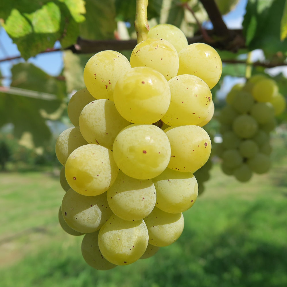 畑に芳醇な香りを漂わす種ありナイアガラです。ワインぶどうとしても名が通っており、香りと酸味、程よい甘みもあり非常にバランスの良い味です。現在の市場では酸味のあるぶどうを見かけることは少なくなっており、ぜひこの機会に種ありナイアガラをご賞味頂ければと嬉しいです。