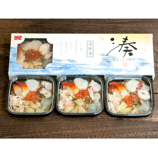 松前漬の上に7種の海鮮具材(ほたて・いくら・ズワイガニ・数の子・たこ・カナダホッキ貝・ひらめ)を載せた豪華な海鮮漬です。そのままご飯に乗せて海鮮丼や海鮮茶漬けとしても楽しめます。