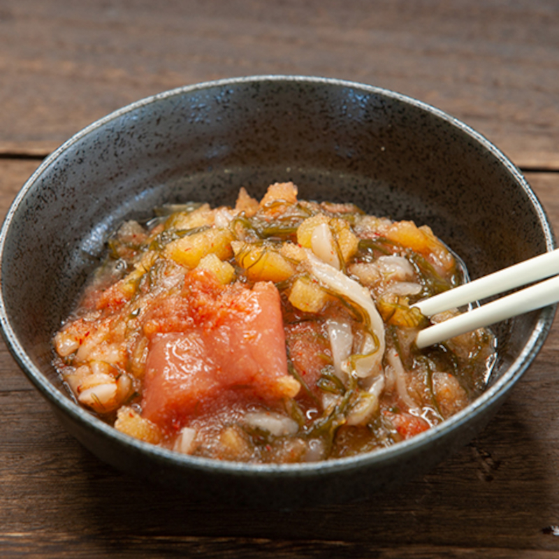辛子明太子に食感の良いめかぶ、いか、味付数の子を和えました。ネバネバ系の食感が楽しいご飯のおかずに美味いです。