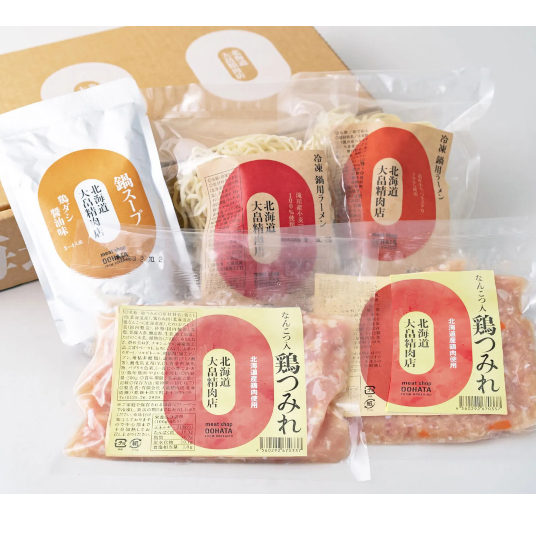 【素材】【鶏つみれ】鶏もも肉(北海道産)、鶏むね肉(北海道産)、たれ(おろし生姜、砂糖、食塩、乾燥人参、醸造酢、生姜、加工油脂、たけのこ水煮、植物油(ごま油)、みじんねぎ、炒め玉ねぎ、チキンエキス、味噌加工品、ごぼうペースト、おろしにんにく、山芋パウダー)、鶏なんこつ(北海道産)/ソルビトール、増粘剤(加工デンプン、増粘多糖類)、調味料(アミノ酸等)、酸化防止剤(V.C)、香辛料抽出物、パプリカ色素、(一部に小麦・ごま・大豆・鶏肉・豚肉・やまいもを含む)【冷凍ラーメン】小麦粉(小麦(北海道産))、小麦たん白、卵白粉末、食塩/かん水、酒精、トレハロース、クチナシ色素、(一部に小麦・卵を含む)【鍋用スープ(希釈用)】醤油(国内製造)、チキンエキス、米発酵調味料、砂糖、たん白加水分解物、食塩、鶏油、かつおエキス、昆布エキス、酵母エキス/調味料(アミノ酸等)、増粘剤(キサンタンガム)、ビタミンB1 、(一部に小麦・さば・大豆・鶏肉を含む)
