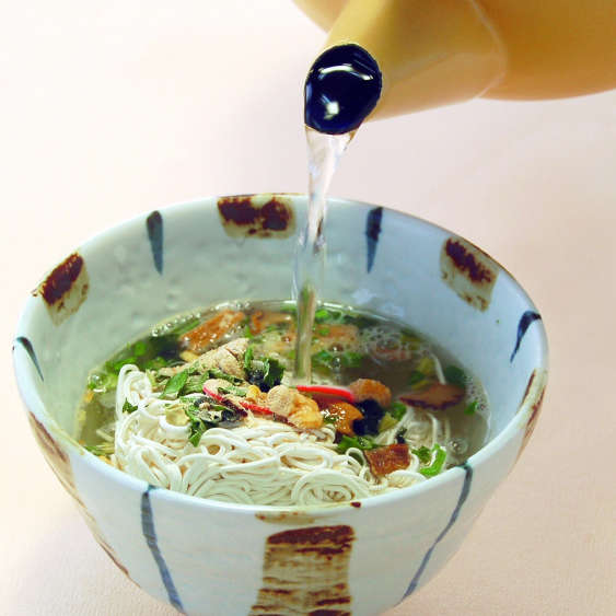 沸騰している方が麺のもどりはよいですが、国際線の飛行機にも搭載していただいたことがあり、沸騰していなくても、麺はもどってまいります(味見をしてよい食感のところでおめしあがりください)