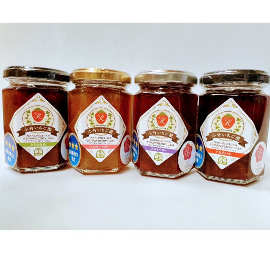 小竹いちご園で朝摘みした「とちおとめ、とちあいか、ミルキーベリー、スカイベリー」をそれぞれ別々に使用した、果肉感たっぷりのいちごジャム。ペクチンなどの添加物は不使用で、素材の甘みと酸味を生かしたやさしい味わい。パンやヨーグルトにはもちろん、スイーツ作りにもおすすめです。