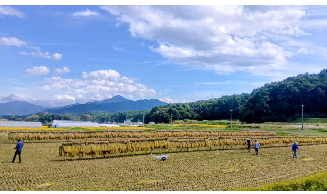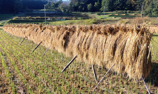 稲刈りしたお米は、乾燥機を使わずに、太陽の力を借りた昔ながらの「はぜ掛け天日干し」で仕上げています。
