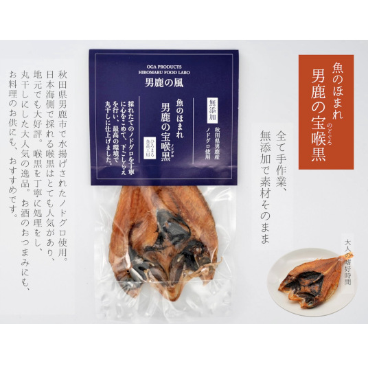 秋田県男鹿市で水揚げされた、ノドグロを弊社で仕入れています。日本海側で採れる喉黒はとても人気があり、地元でも大好評。喉黒を丁寧に処理をし、丸干しにした大人気の逸品です!