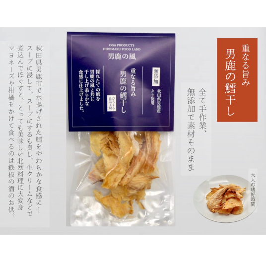 秋田県男鹿市で水揚げされた鱈をやわらかな食感に仕上げました。スープに浸して、スープにするも良し、生クリームなどで、煮込んでほぐすと、とっても美味しい北欧料理に大変身。マヨネーズや柑橘をかけて食べるのは鉄板の酒のお供。