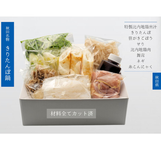 【内容量】きりたんぽ6本・比内地鶏肉200g・比内地鶏特製スープ600cc・マイタケ200g・笹がきゴボウ100g・糸こんにゃく200g・セリ適量・ネギ適量