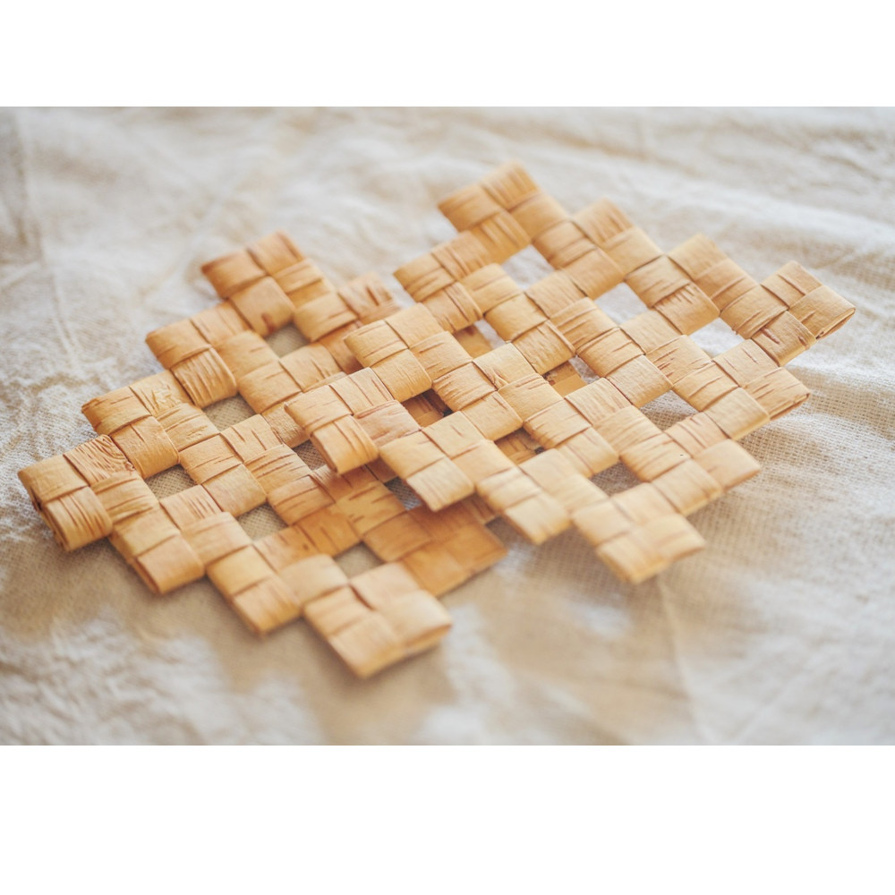 信州白樺高原に自生する白樺の樹皮を、ひとつひとつ丁寧に編み上げたコースターです。白樺の樹皮は、年に一度の限られた時期にのみ採取できる貴重な資源であり、防水性や防油性もあり長持ちします。自然素材ならではのあたたかみと、木の表情をそのまま楽しめる一点もの。お茶やコーヒーの時間に、ほっと心ほどける優しいアクセントを添えてくれます。ナチュラルなインテリアや、心を込めたギフトにもおすすめです。