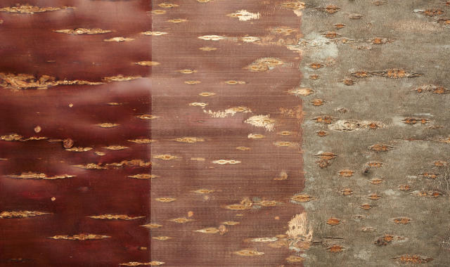 樺細工は山桜の樹皮で出来ており、樹皮をはがしても再生する環境に優しい素材です。その語源は万葉集の長歌の中で、山桜を「かには」と表現したものが後に「かば」に転化したと言われています。山桜の樹皮の表情を生かしたものは「霜降皮」、樹皮を薄く削り研磨したものは「無地皮」と呼ばれます。茶筒のように日々手に触れるものは手沢によって光沢を増し、山桜独特のつやを保ちます。