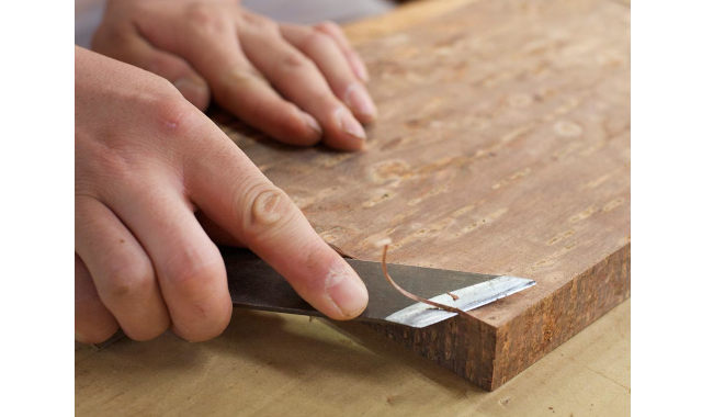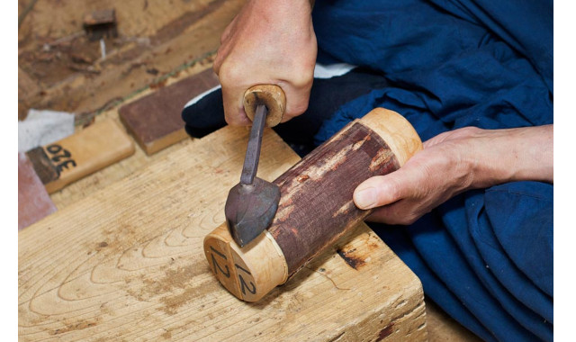 盆や茶櫃のような「箱」を成形する技法です。桜皮や突板を高温に熱した金ゴテで押さえながら、木地に貼ります。角館 伝四郎では相板や素箱がこの技法で作られています。