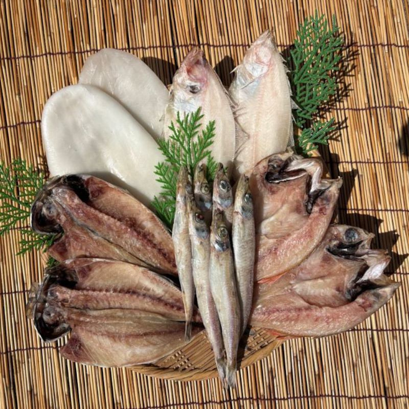 下関港・浜田港・和江港(島根県大田市)で水揚げされた山陰沖日本海で育まれた海の恵みを食塩のみで愛情込めて作りました。 かれいはじっくりと一晩干し上げています。人気の高級魚のどぐろは、食塩のみで旨みを引き立てています。脂質含有量の平均が10%以上で(個体差があります)認定されるどんちっちあじの美味しさを。柔らかくほんのりと甘みのある白いかは、軽く炙ってお好みの調味料でお召上がり頂いても、揚げ物や炒め物等の素材の一つとして料理に使用して頂くと引き立ちます。にぎすは、焼き物として骨離れの良い魚です。また、素揚げやフライにしても美味です。