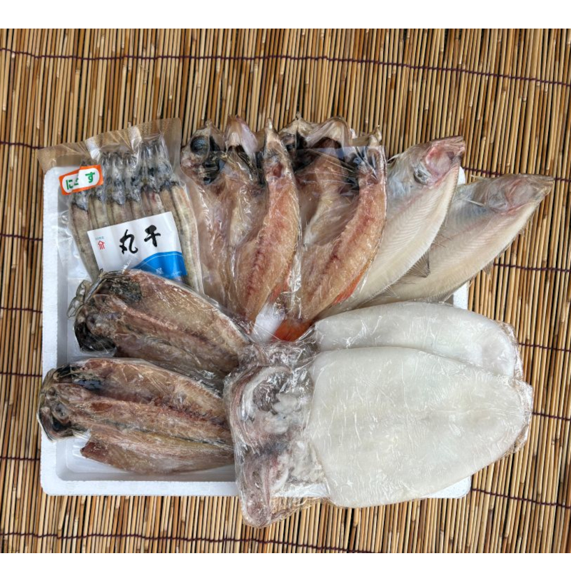 当店で人気のある4魚種の一夜干しと、にぎすの丸干しを詰合せしました。看板商品の水かれい、当社で一番人気のある高級魚のどぐろ、脂質含有量の平均10%以上(個体差があります)のどんちっちあじ、柔らかくほんのり甘みのある白いかとあっさりとした白身の🐟にぎすの丸干しと、いろいろな味が楽しめるセットとなっています。