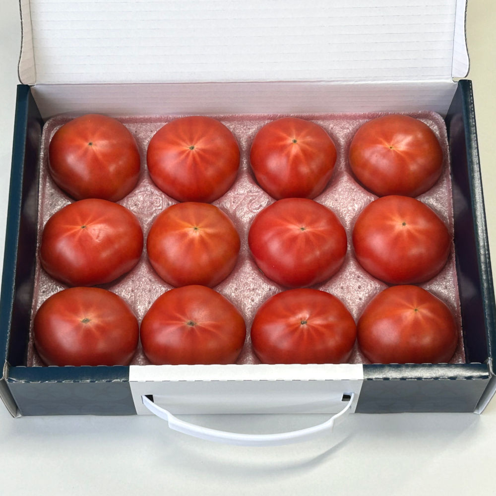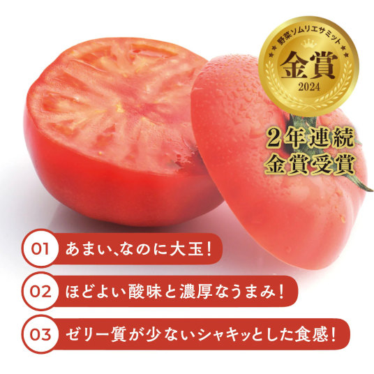 光センサー搭載の選果機によって1玉1玉トマトの糖度を計測し、糖度9度以上※のトマトのみを選別・出荷しており、濃厚な味わいをお楽しみいただけます。味が濃くてあま〜いトマトで、多くのリピーターの方にご支持いただいており、果肉が厚くタネの部分が少ないのが特徴で、トマト嫌いなお子様にもオススメです。
