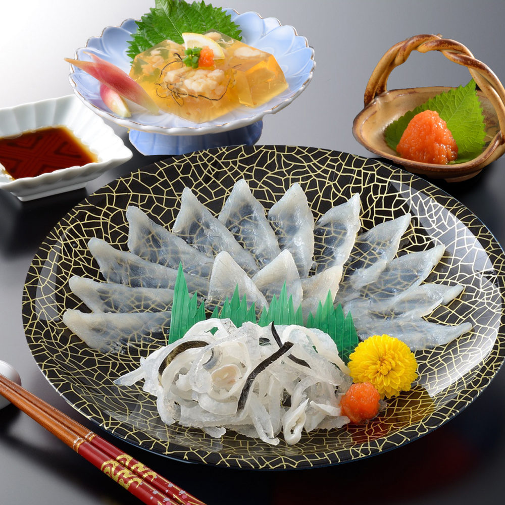 【内容量】とらふぐ刺身(17cm皿)15g、とらふぐ皮20g、ふぐ煮こごり100g、ふくポン酢10g、もみじおろし10g、かぼす果汁2ml