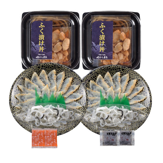 【内容量】真ふぐたたき刺身(17cm皿)20g×2、とらふぐ皮20g×2、ふぐ漬け丼の具70g×2、ふくポン酢10g×2、もみじおろし10g×2
