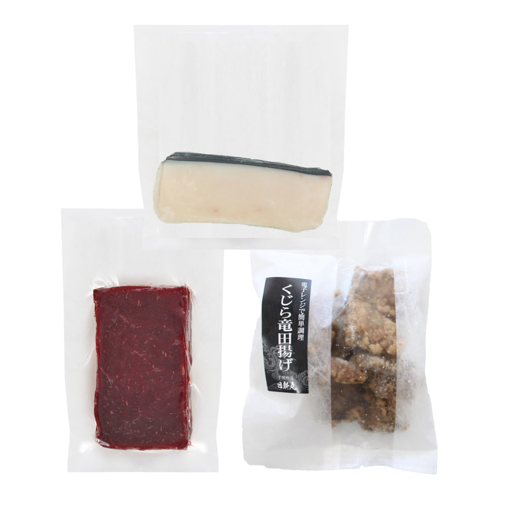 【内容量】鯨赤身肉(刺身用)100g、くじら竜田揚げ(油調済)80g、鯨本皮スライス50g