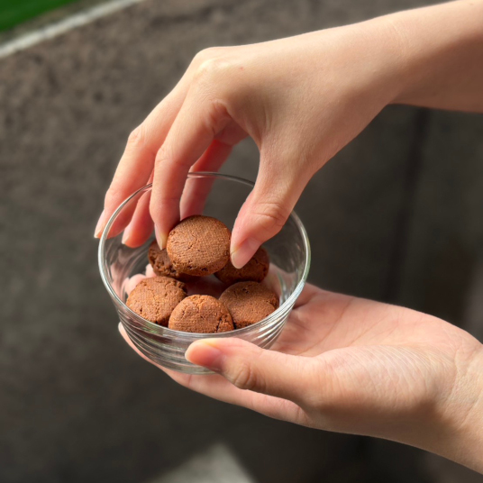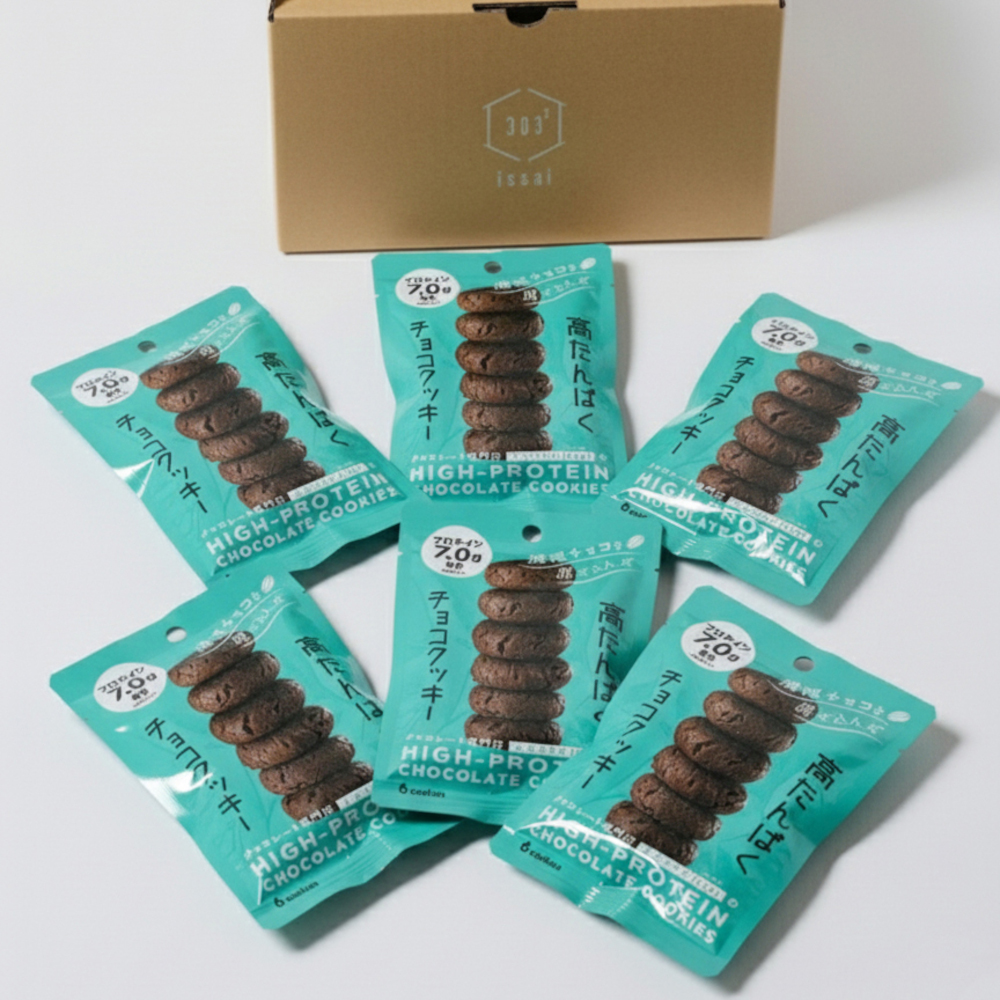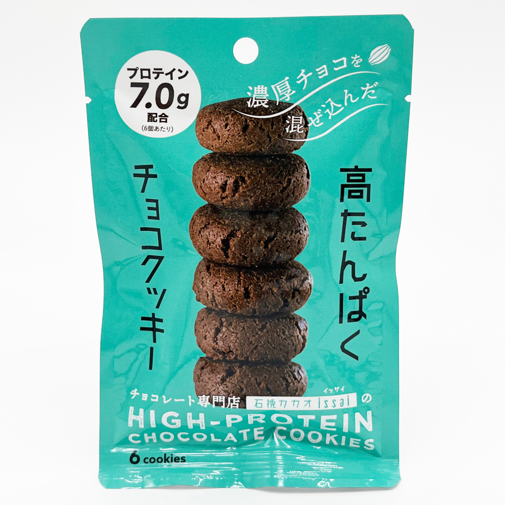 吸収の早いたんぱく質凝縮ホエイパウダー、自社製造のチョコレート(ガーナ産カカオ豆使用)やカカオパウダー、ベルギー製造発酵バターなど素材にこだわった高タンパク商品とは思えない、味わい深いチョコクッキーです。ひとつが小さいので、女性でも人目を気にすることなくパクッと食べられます。
