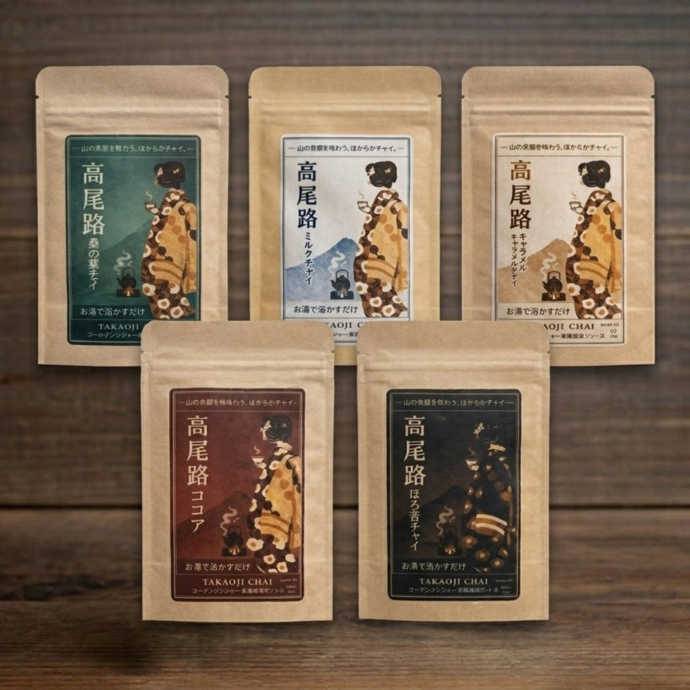 高尾路チャイは、ゴールデンジンジャーと昆布出汁を合わせた、和の発想から生まれた粉末チャイシリーズです。