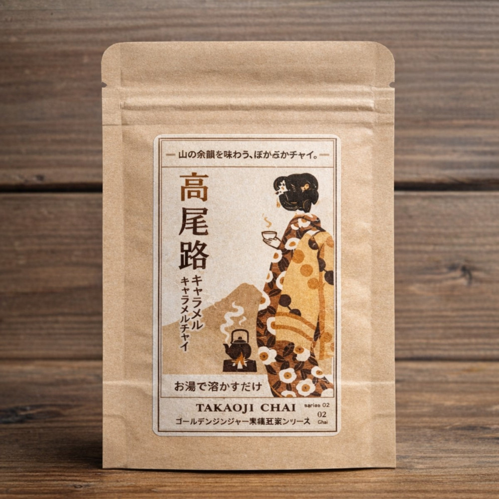 高尾路チャイ 02 キャラメルは、ゴールデンジンジャーと昆布出汁を合わせた、やさしい甘さと香ばしさが広がるキャラメルチャイです。まろやかな口当たりの中に、ほっとする余韻が広がり、外でも家でも飲みやすく仕上げました。