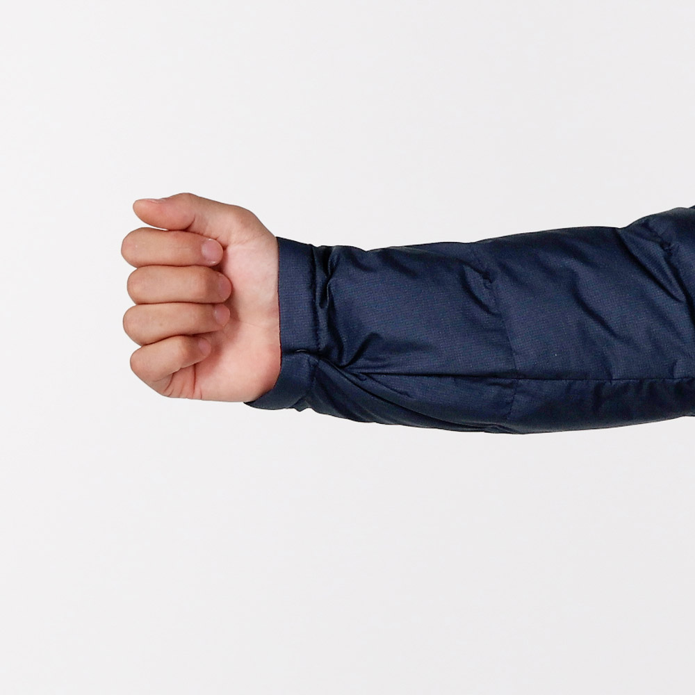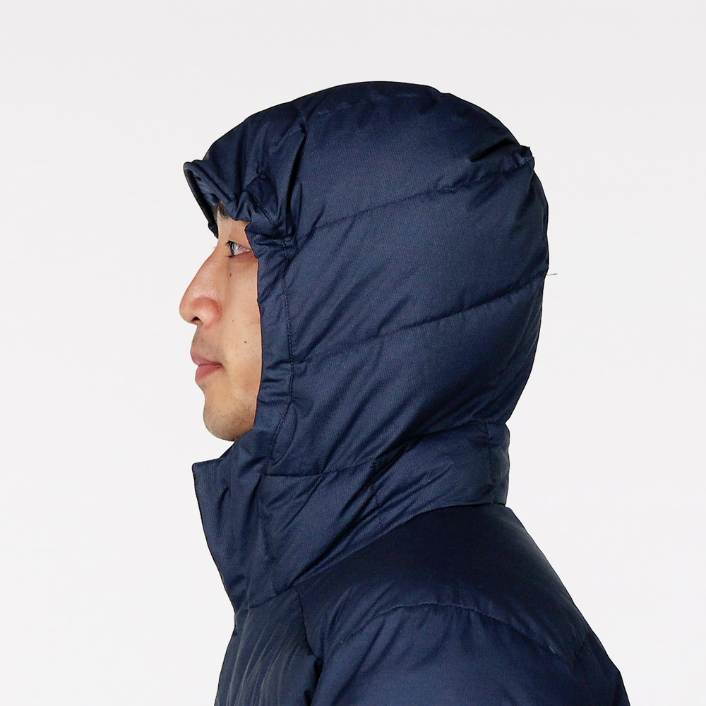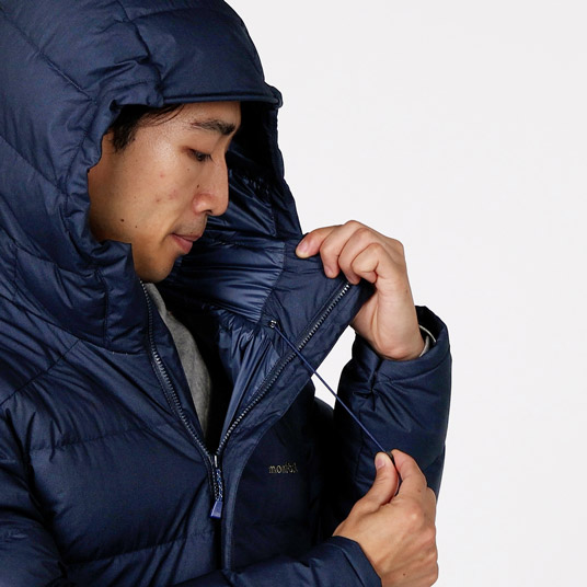 【特長】三枚差し構造(身頃、袖) / シングルキルト構造(フード) / ダウンプルーフ加工 / ジッパーがあごに当たらない仕様 / スタッフバッグ付き