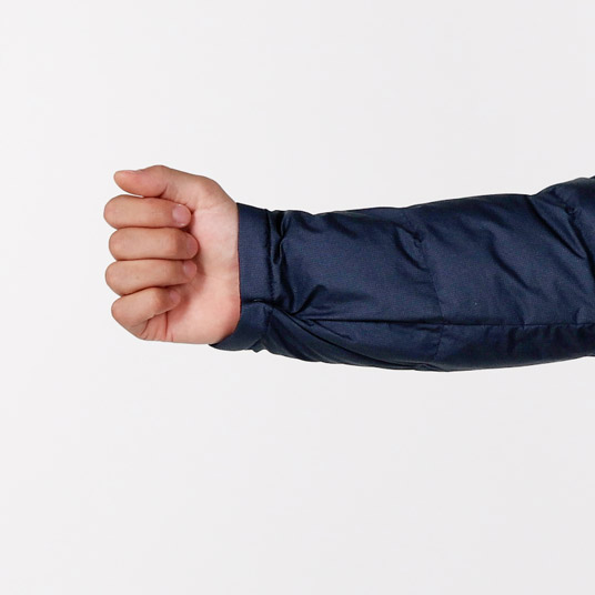 表地と裏地をつぶし縫いで縫製。ダイヤモンド状や帯状に縫製することで、中綿の片寄りを防いで保温効率を高め、軽量・コンパクト性にも寄与します。