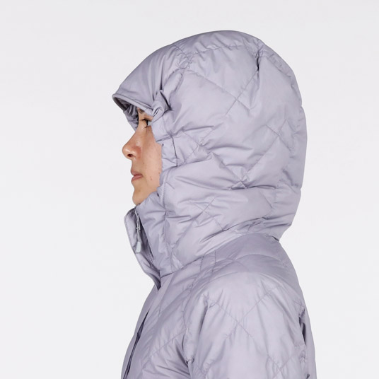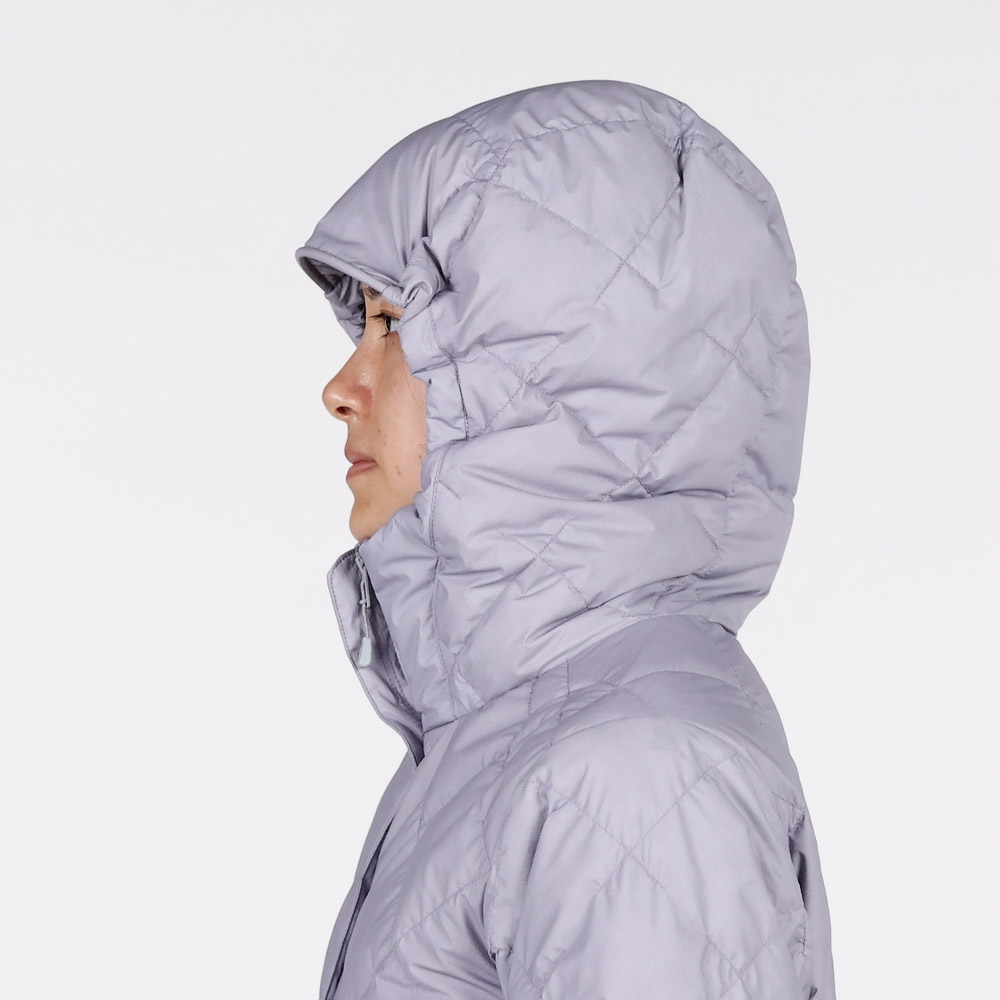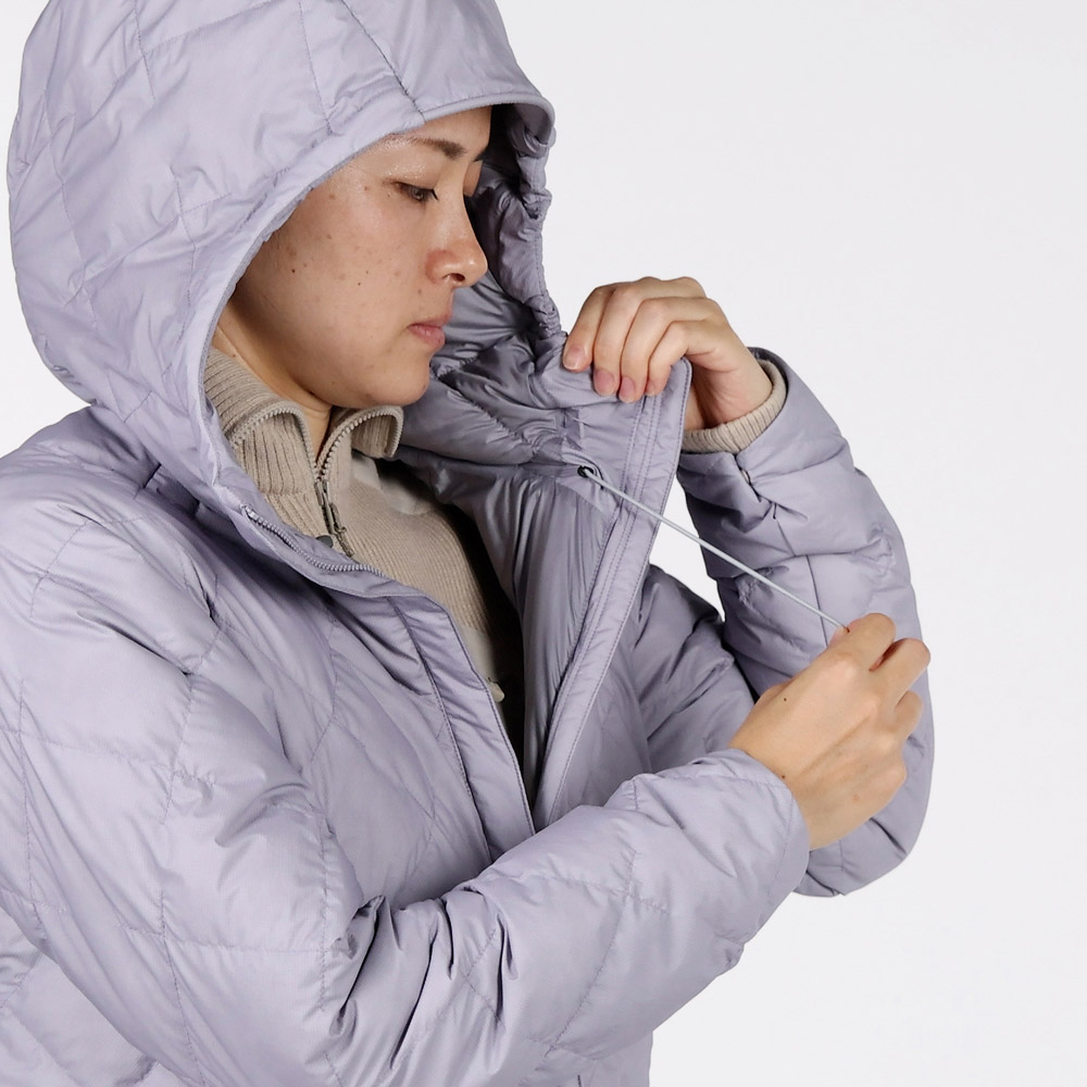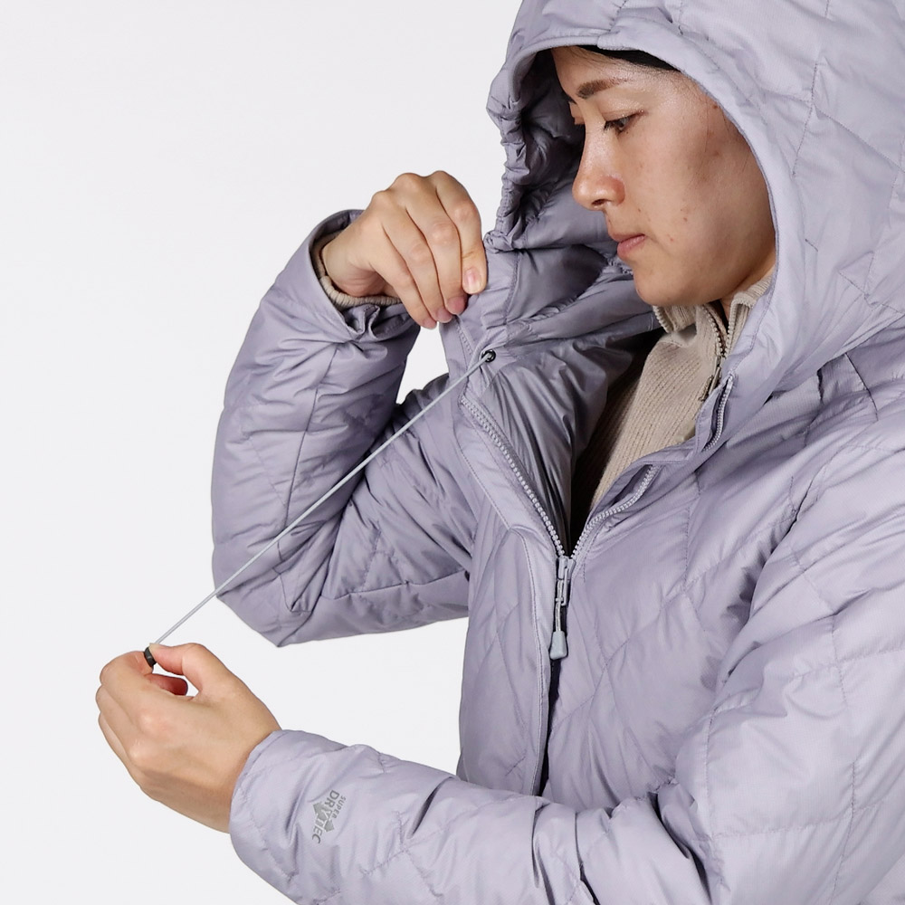 【特長】独自のキルティングパターン / 三枚差し構造(身頃、袖) / シングルキルト構造(フード) / ダウンプルーフ加工 / ジッパーがあごに当たらない仕様 / フードの周囲はドローコードで調整可能 / スタッフバッグ付き