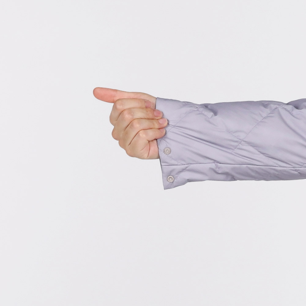 表地と裏地をつぶし縫いで縫製。ダイヤモンド状や帯状に縫製することで、中綿の片寄りを防いで保温効率を高め、軽量・コンパクト性にも寄与します。