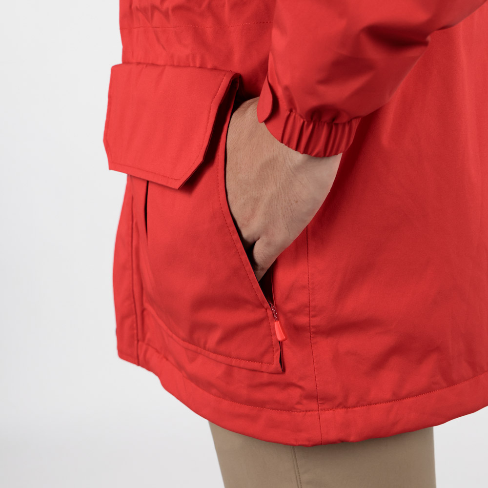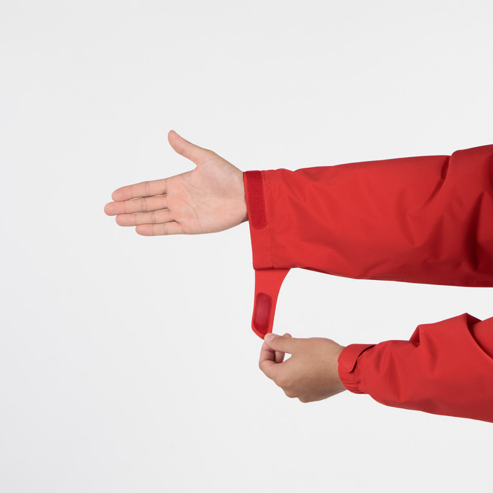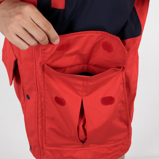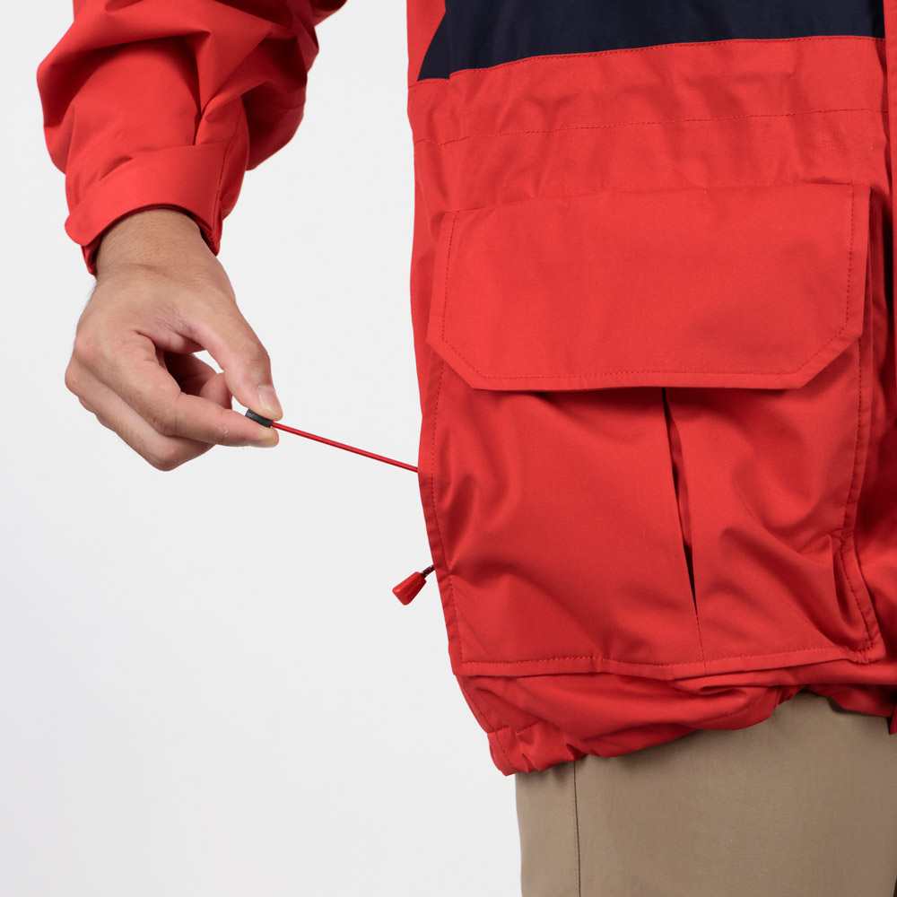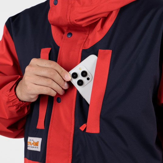 本製品は縫い目を目止め(シームテープ)処理することで身体側に水が浸入しないように設計されていますが、構造上ポケットの内部は浸水する恐れがあります。貴重品等は防水ケースに入れるなどして防水対策をしてください。