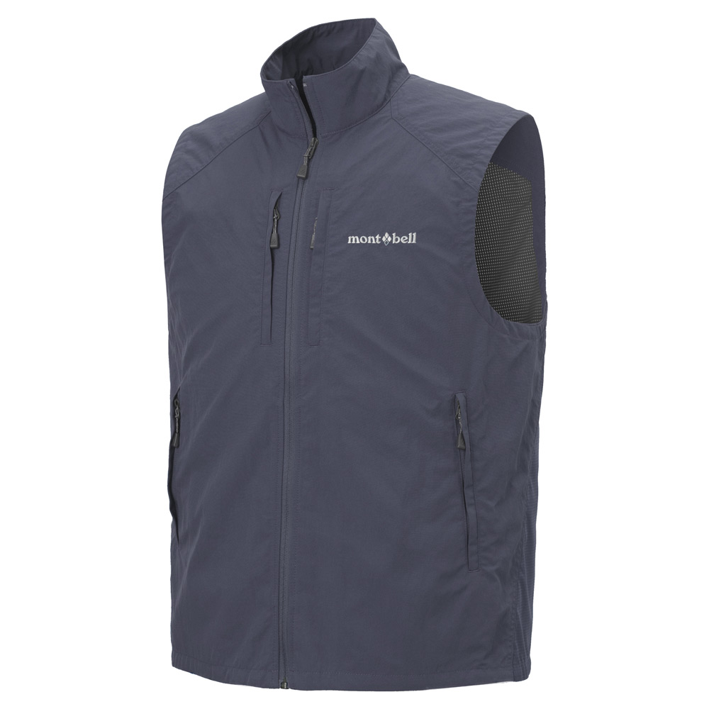 すっきりとしたシルエットのベストです。前面は両胸と両腰の4カ所にポケットを配置。表地は防風性とはっ水性を備えたコットンのような薄手のナイロン地を使用しています。背に通気性に優れたメッシュ素材を使用することで、蒸れにくく快適な着心地を保ちます。