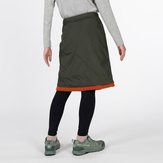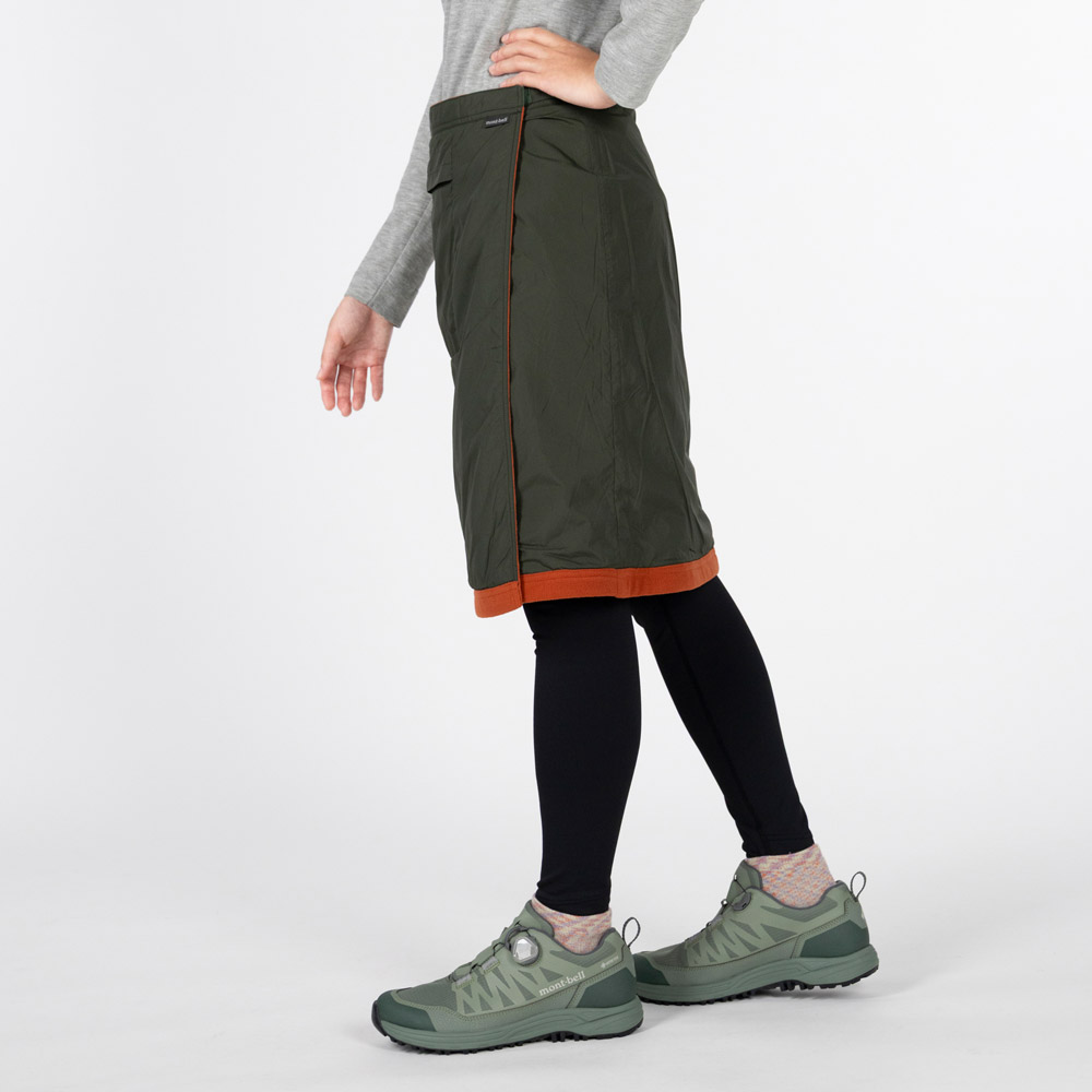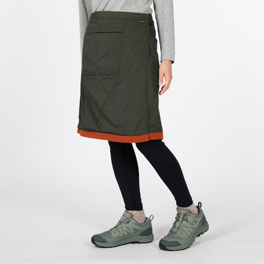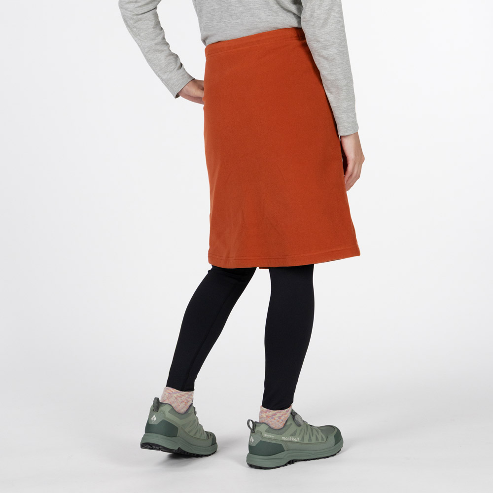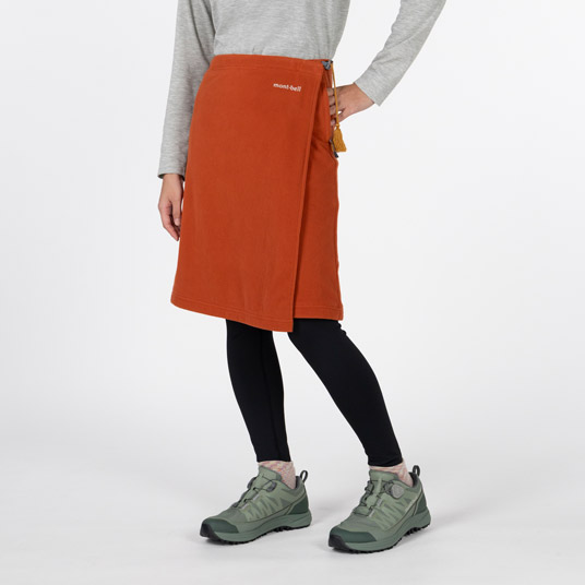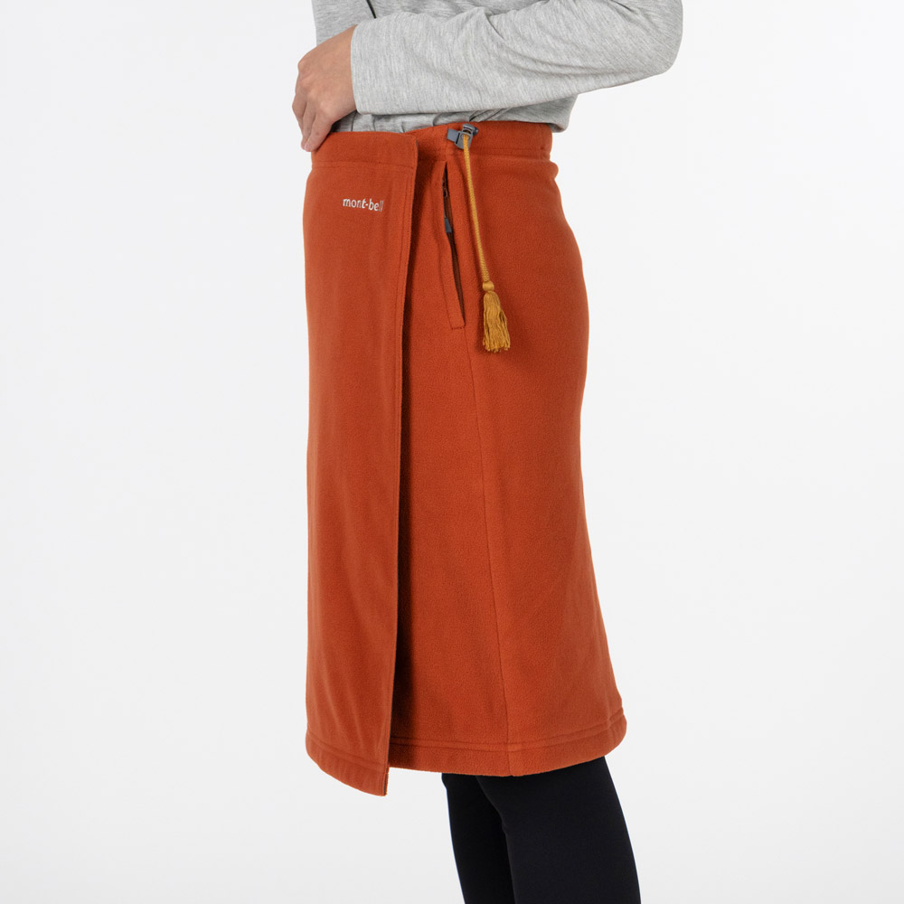 暖かなシャミース™地の巻きスカートです。表面には暖かなフリース地、裏面には足さばきのよいナイロン地を使用。ナイロン地には高いはっ水性を持ち、汚れが付着しにくいはっ水加工を施しているため、食事などの際には裏返してひざ掛けとしても利用できます。