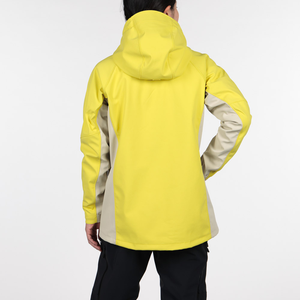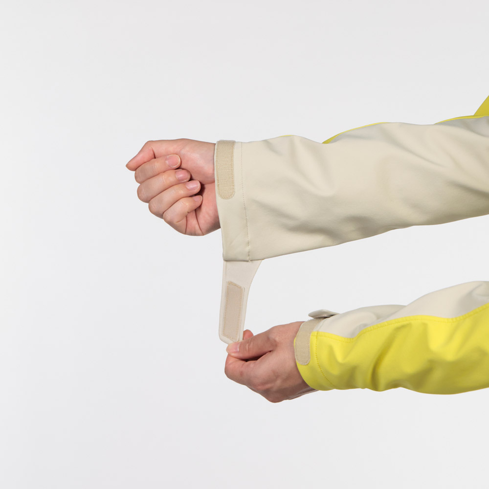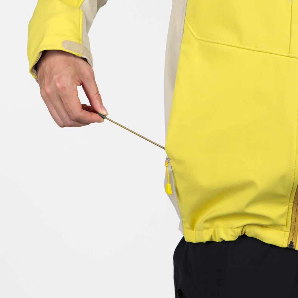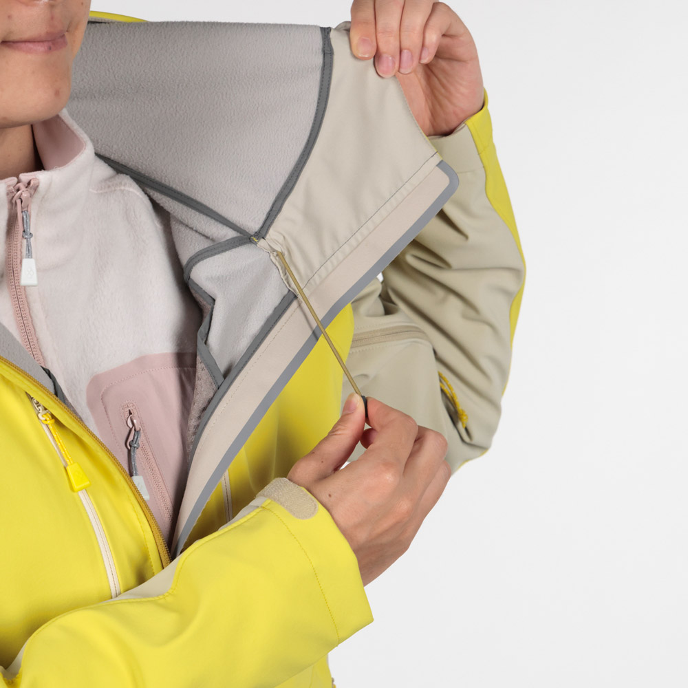 【特長】トライアクスルフード / スムースピットジップ / ジッパーが顔に当たらない仕様 / ヘルメットの上からも被れるフード / 立体裁断(ひじ) / アルパインカフ / リードインコード・システム(すそ)