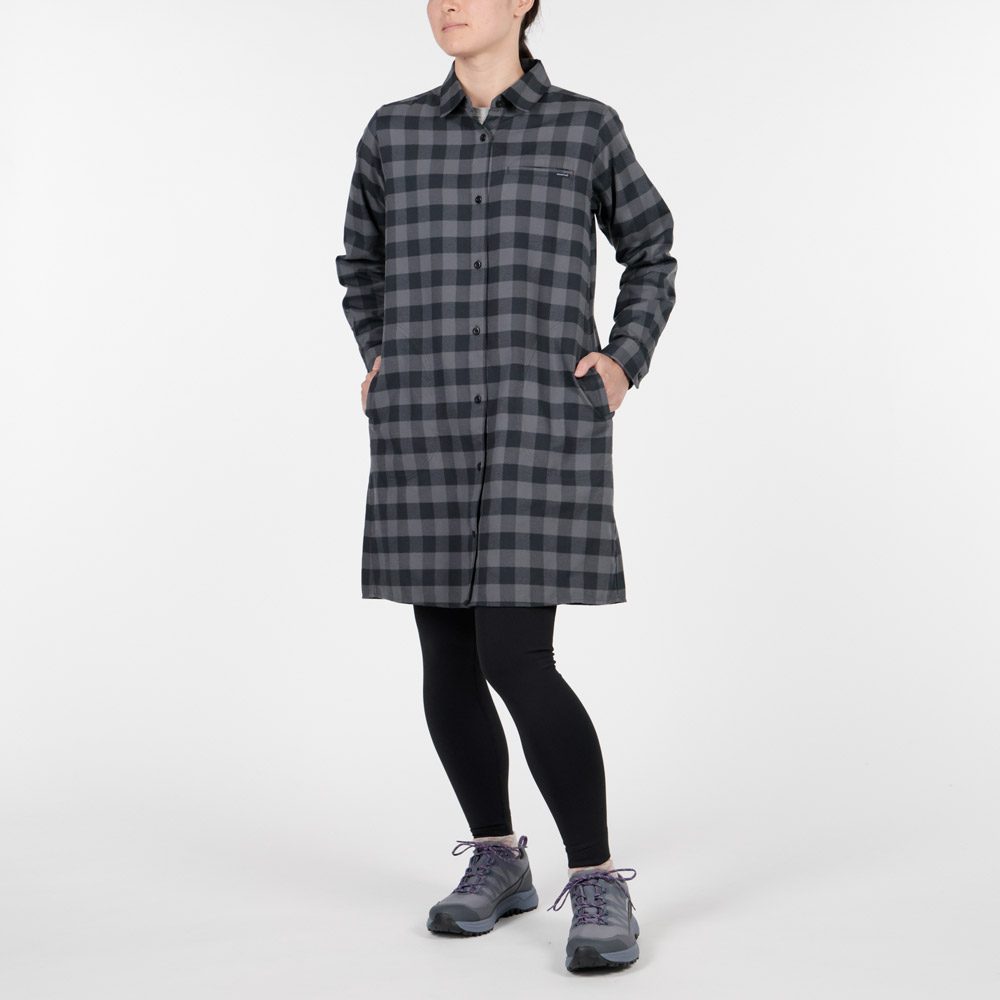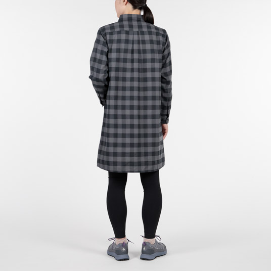 トレッキング用シャツワンピースです。柔らかな風合いで、吸水拡散性と適度な保温性を備えた中厚手のウイックロン®を使用。片胸ポケット仕様のシンプルなデザインで、パンツを履いた際に足さばきの良い短めの丈です。