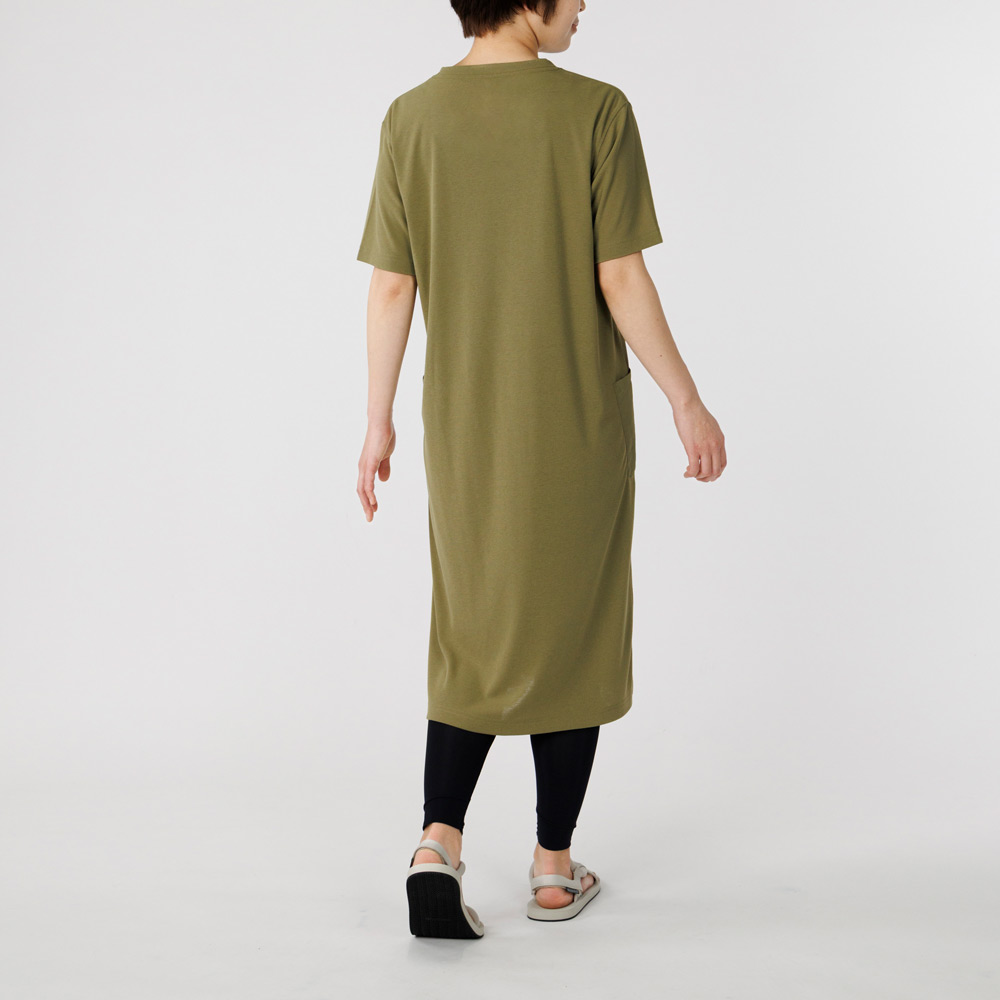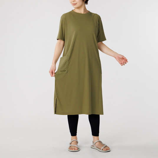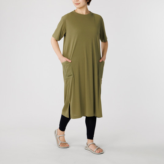山小屋泊などでリラックスウエアとして着用できる、速乾性と通気性に優れたワンピースです。ゆったりとしたシルエットで、足元にはスリットが入っており、足さばきがしやすいです。ウイックロン®を伸縮性の高いリブ編みにすることで、高いストレッチ性を持たせています。