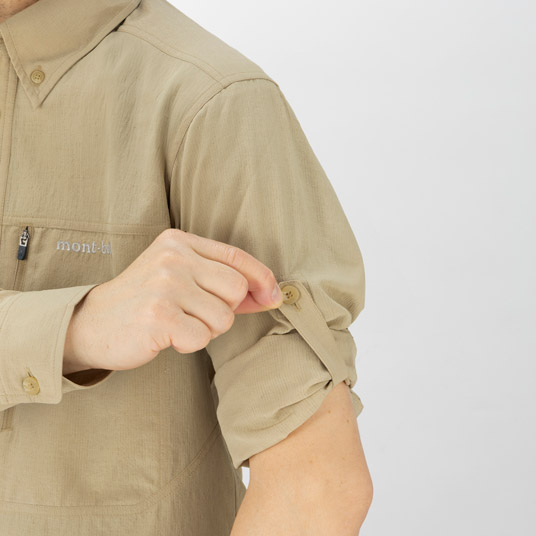 暑い時季でも心地よい通気性と速乾性、麻のようなシャリ感のある風合いを備えた長袖シャツです。気候に応じて、袖はロールアップでまくることもできます。トレッキングから日常使いまで、幅広い場面で快適に着用できます。
