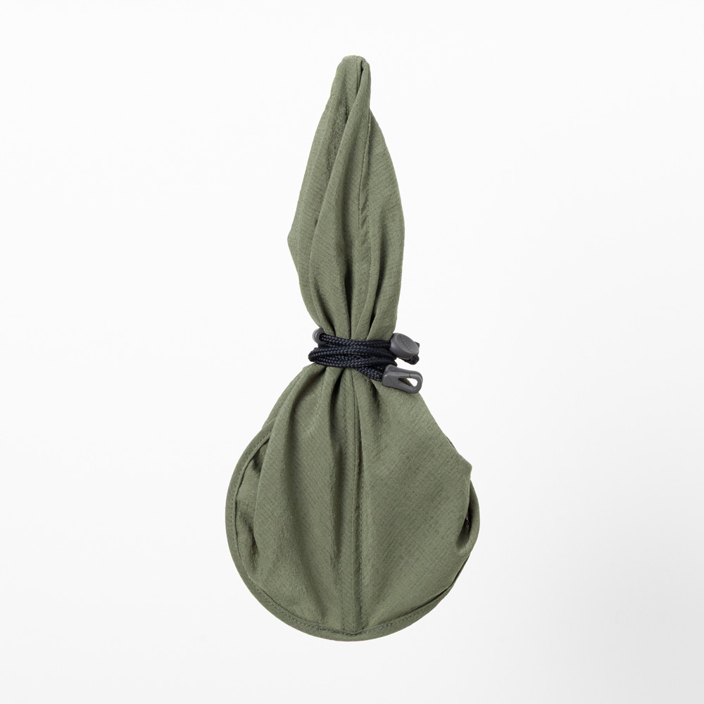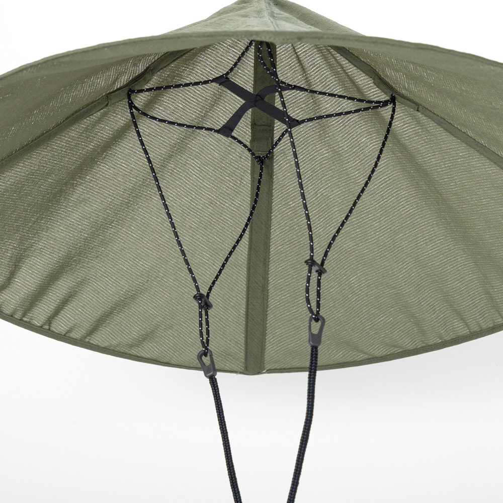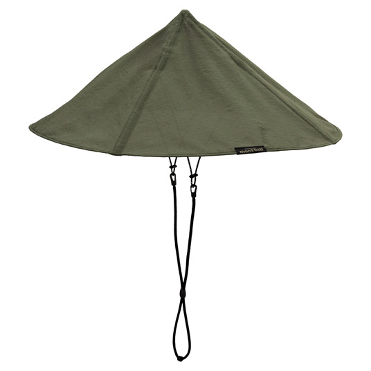 笠をモチーフにしたユニークなデザインのハットです。簡単に折りたたむことができ、瞬時に元の形状に広がるポップアップ仕様。天頂部に空間があるので蒸れにくく、ハイキングや水遊びなどに適しています。風通しが良い素材を使用し快適な着用感です。風が吹いても飛ばされにくいあごひも付き。型くずれを防ぐ芯材入りです。
