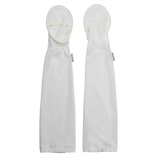 手甲をヒントに開発した、手の甲まで覆う日除け付きのアームカバーです。日除けカバーには芯が入っているため、型くずれしにくくなっています。生地の紫外線保護指数は最高レベルのUPF50+で、効果的に日焼けを防ぎます。通気性と速乾性に優れ、制菌防臭でにおいにくく快適性が持続します。適度にゆとりがあるシルエットで、上部に設けたゴムを引っ張るだけでフィット感の調節ができます。