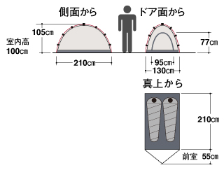 【本体重量】0.89kg(1.09kg) ※本体重量はポールを含みます。( )内はペグ、張り綱、スタッフバッグを含む総重量です。別売のレインフライを含む重量は1.24kg(1.45kg)